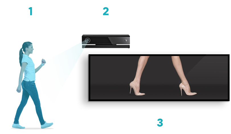 To demonstrate this innovative use of technology, we created a shoe store window display that interacts with passers-by, using input from a Microsoft Kinect sensor that detects movement. Designed to be activated when someone walks by, it features a model on a video wall walking by your side, like following your steps! Furthermore, the model is ‘wearing’ the shoes that are placed in front of you.